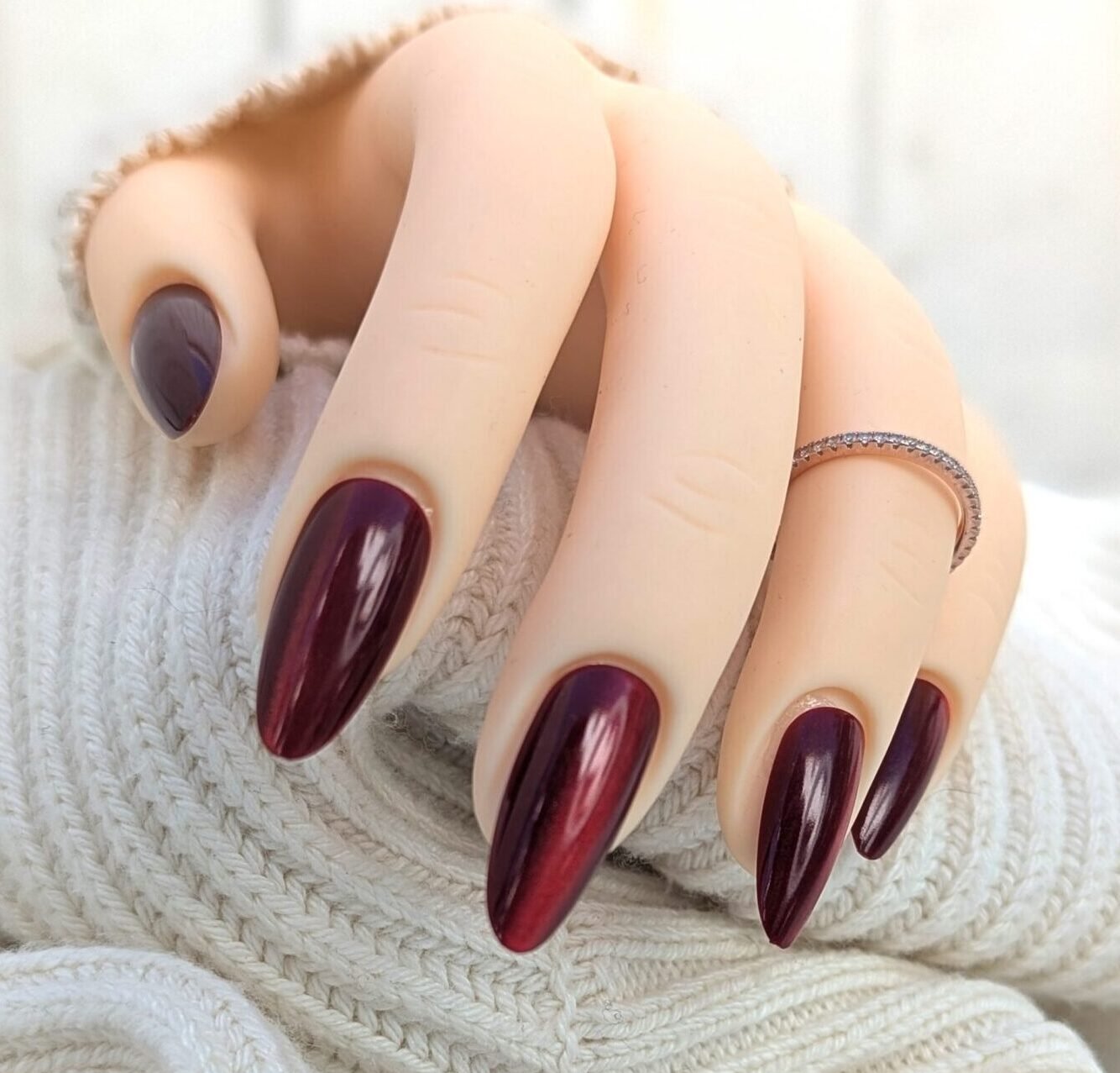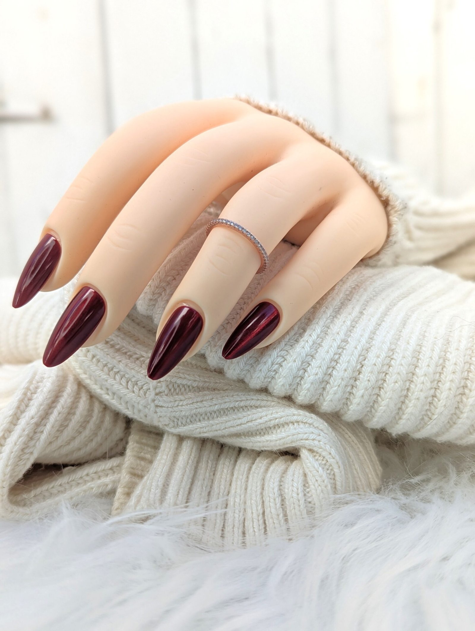 Glossy burgundy press on nails in almond shape with deep red finish for timeless elegance.