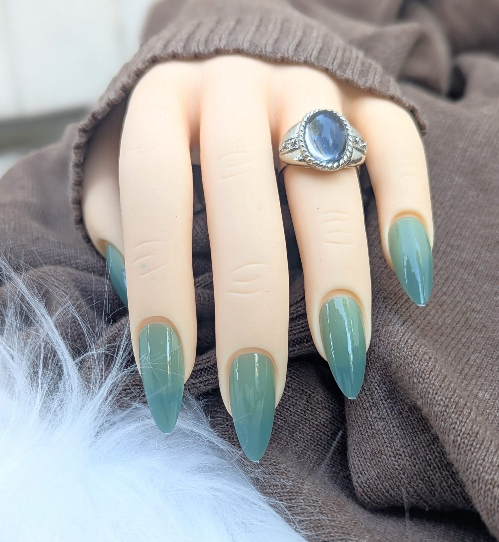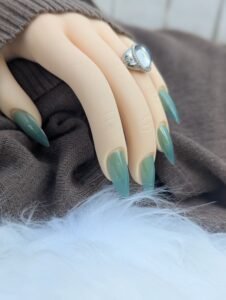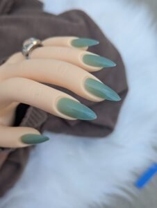Glossy green ombre press on nails in long almond shape for soft, minimalist everyday wear.