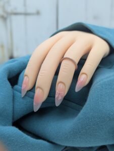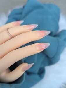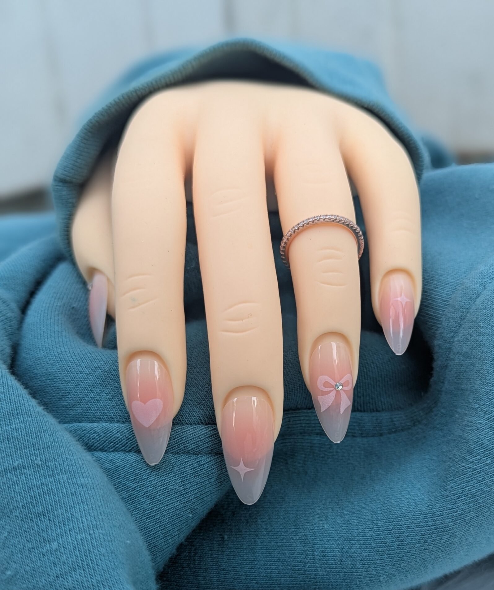 FREE SHIPPING on orders over $45Soft ombre pink nails with heart and bow accents, reusable, comfortable, and simple to apply.
