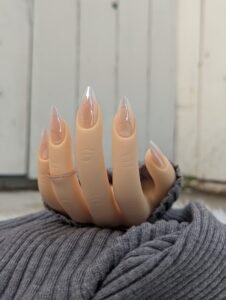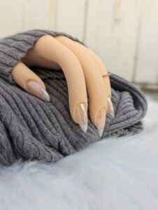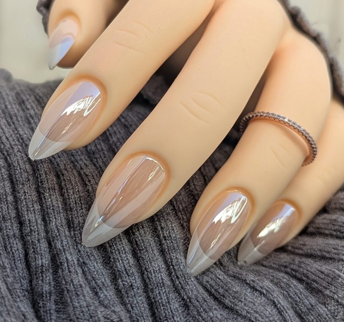 FREE SHIPPING on orders over $45Nude almond nails with reflective silver chrome French tips for a sleek, modern, glossy everyday style.