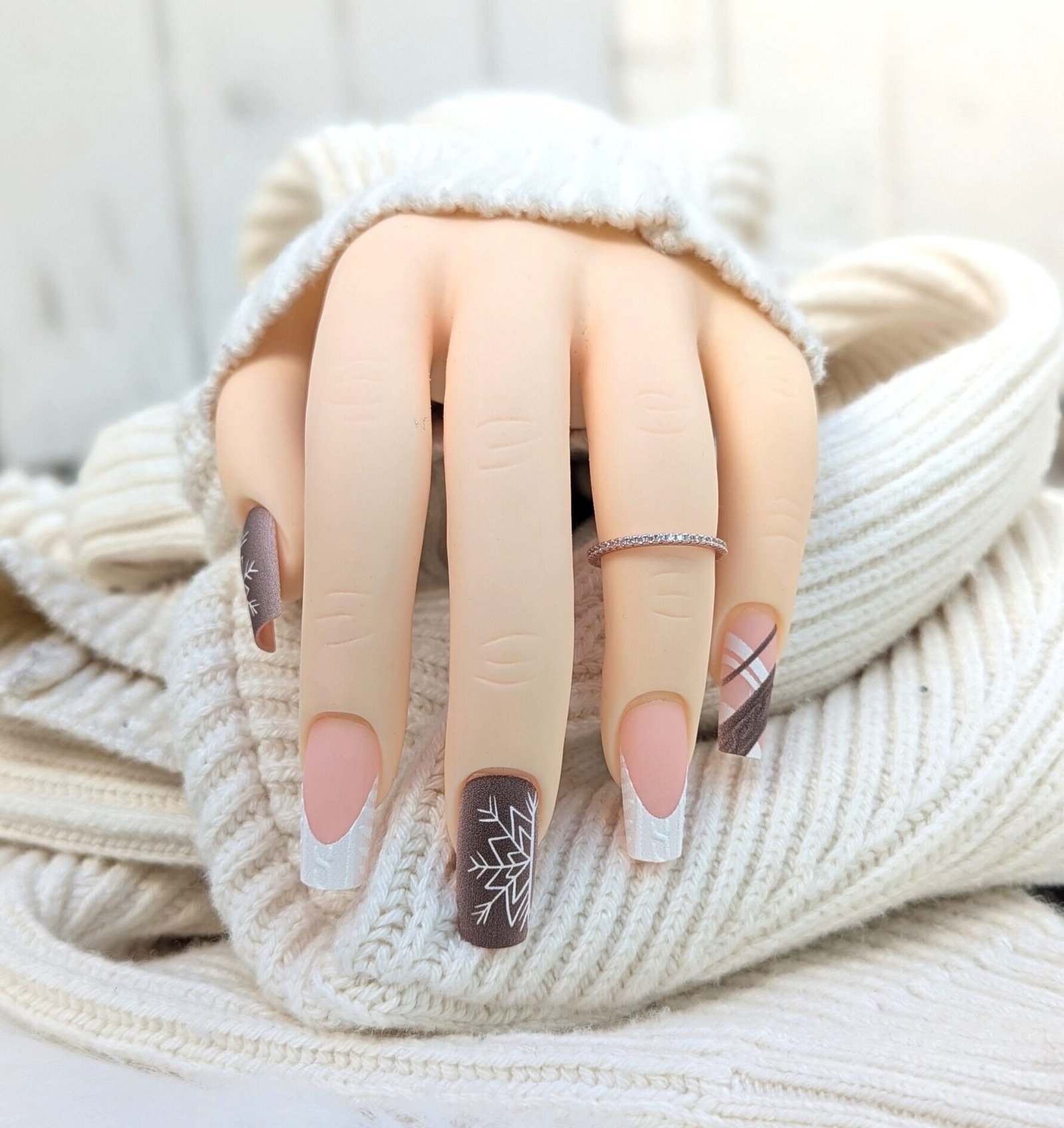 Cozy winter press-on nails with brown snowflakes and white sweater tips for your soft seasonal look.